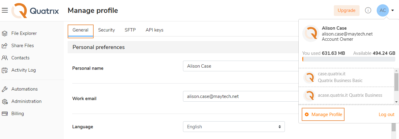 The account owner is the top administrator of the account that has access to all Quatrix features and can purchase more users for the account. They own and manage the account for as long as they are the account owner. At any point, the ownership rights can be transferred to someone else in the account.