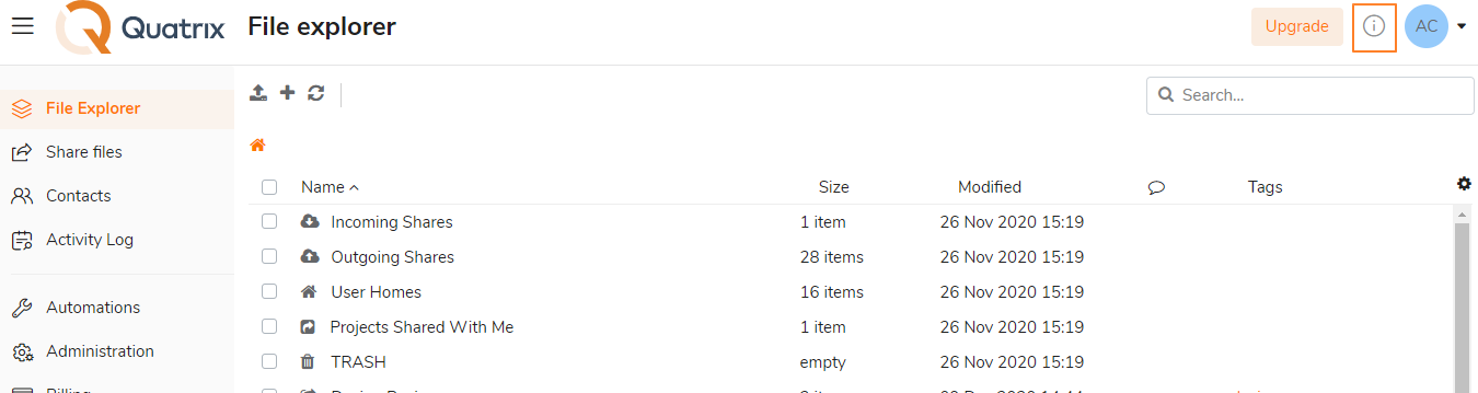 You can take our quick tour to learn the basics of Quatrix, discover useful features and functions available for administrators and users and find other useful links on the information box at the top panel.